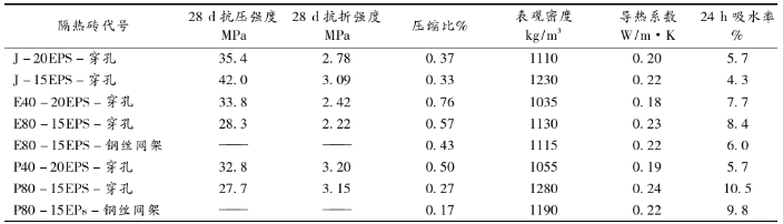 從輕質骨料混凝土種類和層面聯接方式改變時,復合隔熱磚相關性能的結果可以得出,由于在EPS板和混凝土面層間形成了連通的水泥砂漿柱,當試件承受抗折荷載時,大部分試件折斷面經過處于中間的三個水泥砂漿柱,水泥砂漿柱的抗折強度遠高于EPS板的抗折強度,因此與試件的抗折強度相比,基準試件抗折強度均有較大幅度的提高,但相應試件的抗壓強度卻有降低,這也進一步說明EPS板的抗壓塑性有助于提高復合隔熱磚的抗折強度。