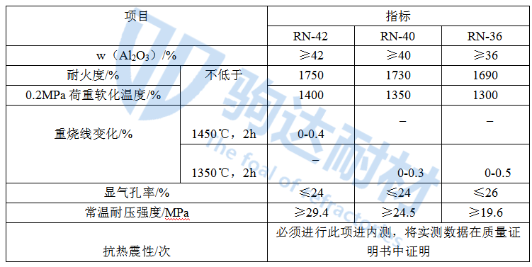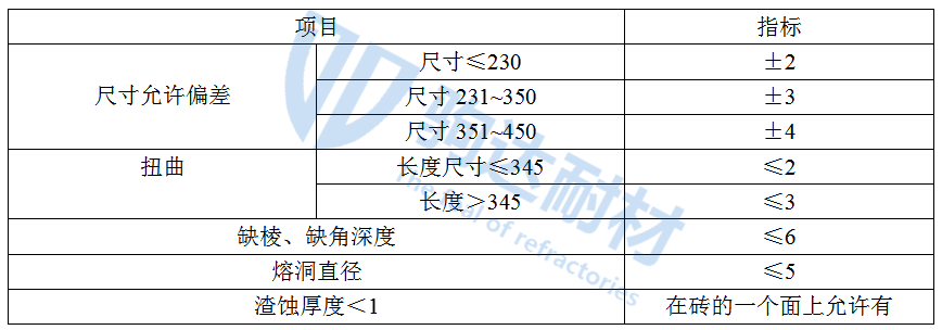 YB/T5107-1993將熱風爐用黏土質(zhì)耐火磚按理化指標分為RN-42、RN-40、RN-36三種牌號。其理化指標、尺寸允許偏差及外觀見表1和表2。