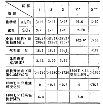 試樣配好經混合后,用顆粒澆注法制成25×25×140(mm)的試樣和36×50(mm)的試樣。干燥(110℃×12h)后在1500℃×3h下燒成、對三種試樣的性能進行了測定并與英國和蘇聯的同類產品性能做比較,結果列于表三。