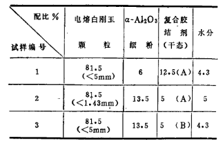 試驗所用的顆粒為電熔白剛玉,細粉部分為α-Al2O3,它們的化學組成列于表1、電熔白剛玉破碎成<5mm和<1.43mm兩種顆粒、α-Al2O3磨成<0.088mm的細粉 按表二的配比制作了三種試樣。
