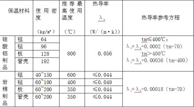設備和管道的保溫伸縮縫和膨脹間味的填塞材料采用硅酸鋁氈(介質溫度>350℃)和巖棉氈(介質溫度≤350℃),典型的保溫材料技術性能參數如下表所示。