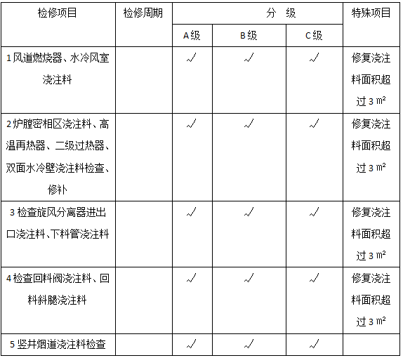 表1耐火耐磨保溫澆注料檢修項(xiàng)目