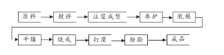 采用目前輕質莫來石保溫磚生產常用的注漿成型法,自然養護至脫模后,移入強制式干燥器中干燥,然后經過高溫燒成,燒成坯體經過機械打磨加工即為成品。流程見圖1。